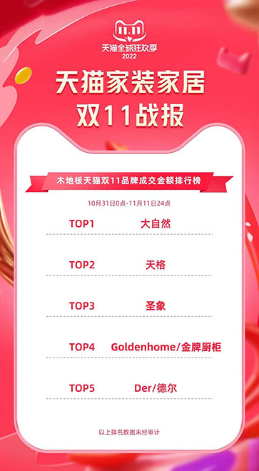資料顯示,大自然地板自2016年參加天貓雙11活動(dòng)以來,已經(jīng)連續(xù)第7年奪得地板品類銷冠。
