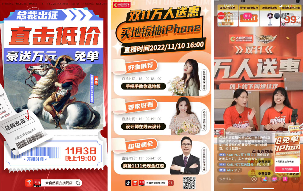 大自然家居將雙11活動(dòng)提前至10月,形成“錯(cuò)峰引流”態(tài)勢(shì),以抖音+微信+天貓/京東作為營銷傳播主戰(zhàn)場(chǎng),以節(jié)奏強(qiáng)勁的打法推出“圖文+視頻+軟文+直播”等營銷組合拳,以場(chǎng)景化的營銷模式,最大程度地吸引用戶的關(guān)注。