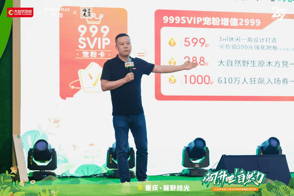 為了回饋新老客戶的信任與支持,與新消費力量同頻共振,大自然地板重慶分公司總經理王凱表示:本次活動集團總裁攜百萬豪禮回饋重慶老客戶朋友,現場首發999SVIP權益卡100張,為消費提供價值2999元寵粉大禮包,致敬所有客戶的信任與支持。