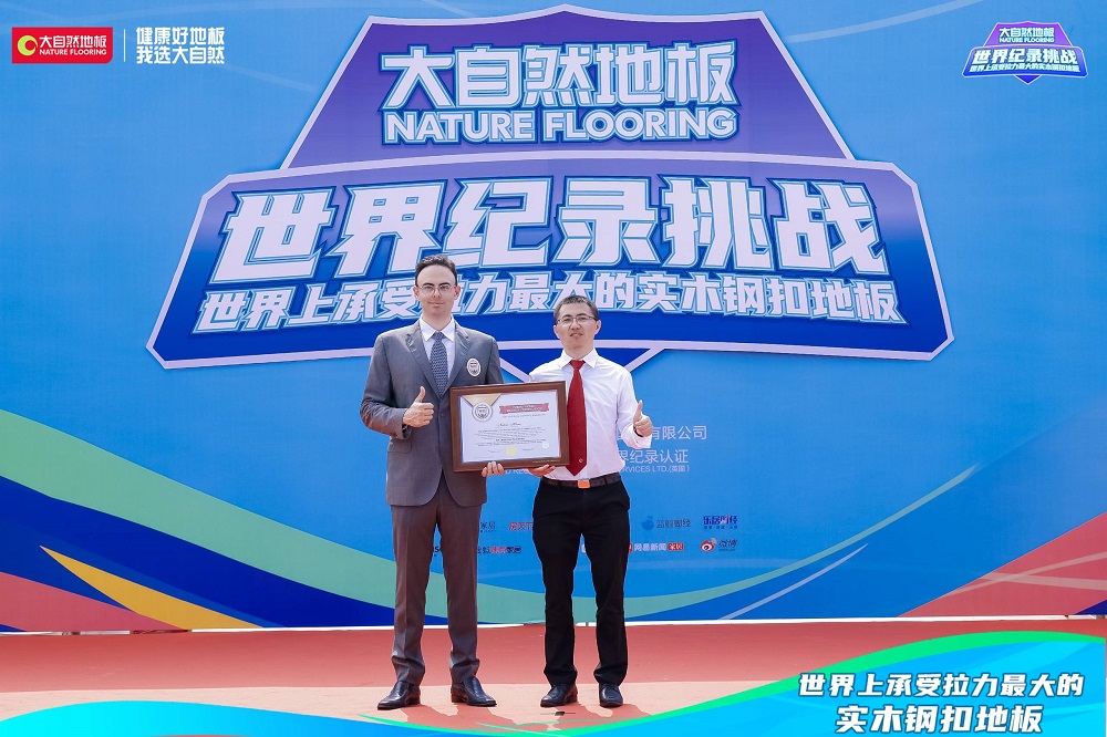 經(jīng)福布斯世界紀錄認證官方機構認證官現(xiàn)場記錄并宣布:大自然實木鋼扣地板最大的承受拉力為12806N,世界上承受拉力最大的實木鋼扣地板——大自然地板世界紀錄挑戰(zhàn)成功。隨后,在全體嘉賓、媒體、現(xiàn)場觀眾和線上廣大消費者的見證下,福布斯世界紀錄認證官方機構認證官為大自然家居授予世界紀錄稱號獎牌,現(xiàn)場掌聲雷霆,歡呼爆發(fā)。