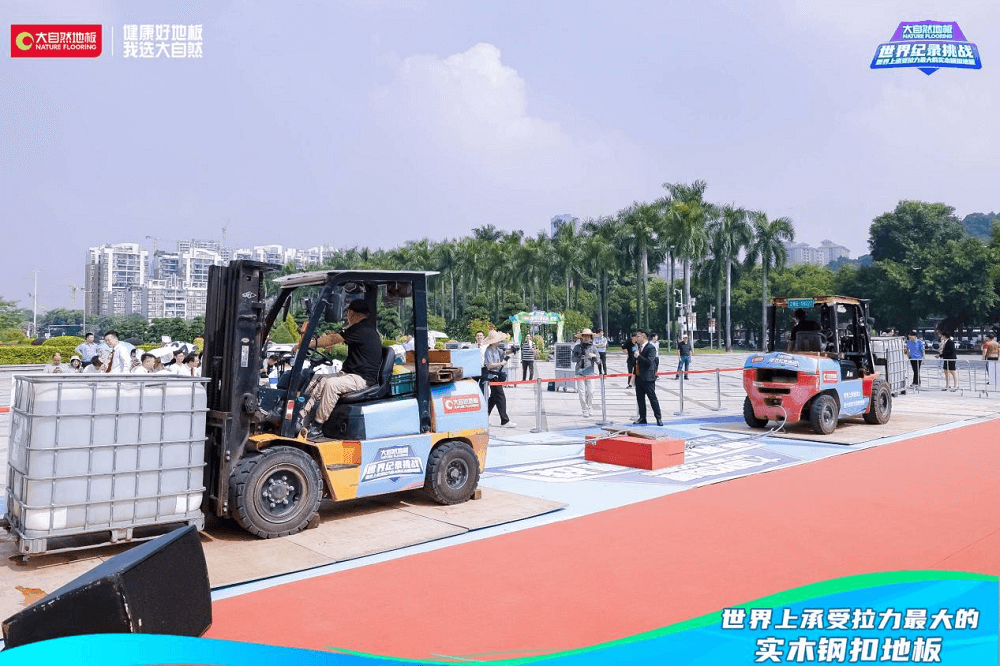 金秋十月,順峰飄香。在萬眾期盼中,大自然地板攜手福布斯FWRC世界紀錄認證機構,發(fā)起的“世界上承受拉力最大的實木鋼扣地板”世界紀錄挑戰(zhàn)活動,在亞洲最大的牌坊——佛山順德順峰山公園牌坊盛大開啟。當天早上,兩輛重量高達5噸的叉車擺好“陣勢”,引來現(xiàn)場觀眾駐足觀看,線上直播同步進行,組成線上打call團,共同見證。