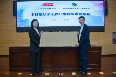 2025年3月13日,中國林業科學研究院木材工業研究所與大自然家居(中國)有限公司在北京共同發布“木材超分子無膠纖維板技術”
