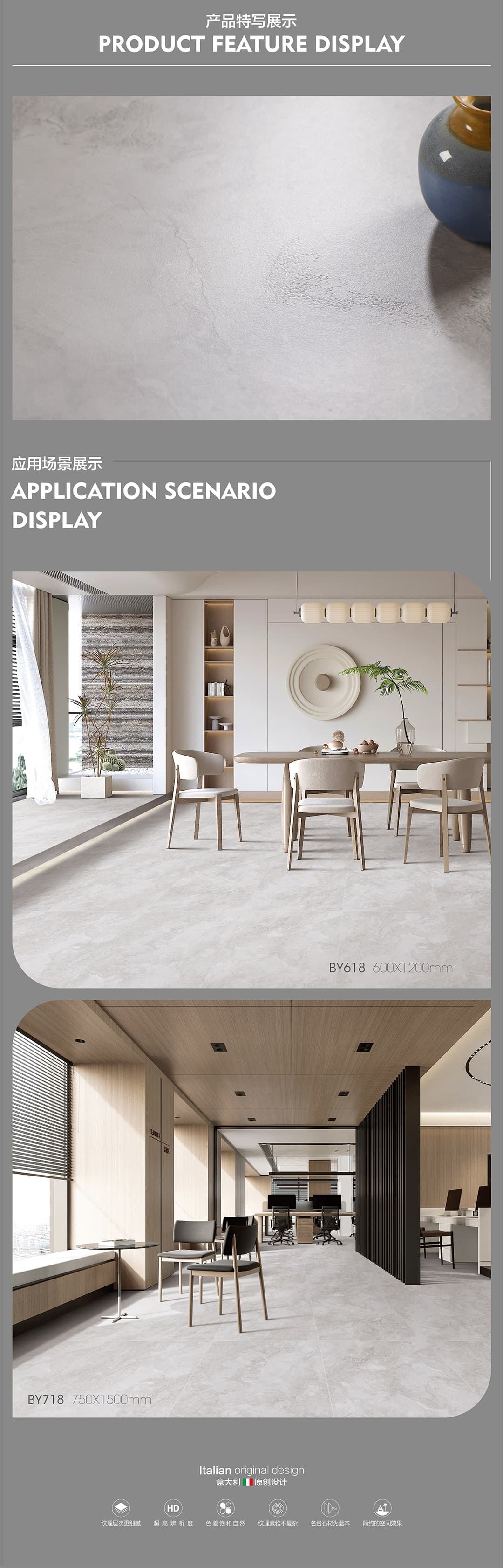 產品特性 表面柔和,防污效果強,防滑R10指標高,抗折強度好